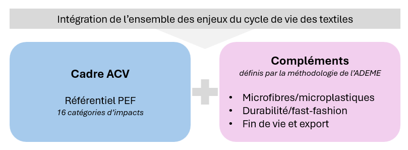 La méthodologie développée par l’ADEME et le ministère de la transition écologique s’appuie sur les indicateurs d’analyse du cycle de vie (ACV) définis au niveau européen dans le cadre du Product Environmental Footprint (PEF). Ces indicateurs permettent d’évaluer les impacts environnementaux liés à la consommation d’énergie et d’eau, ainsi qu’aux pratiques agricoles associées à la production textile, comme l’irrigation ou l’usage de pesticides et d’engrais. Ils sont regroupés autour de quatre grands enjeux : le climat, la biodiversité, la santé environnementale et les ressources.