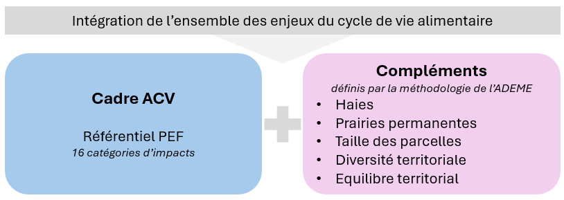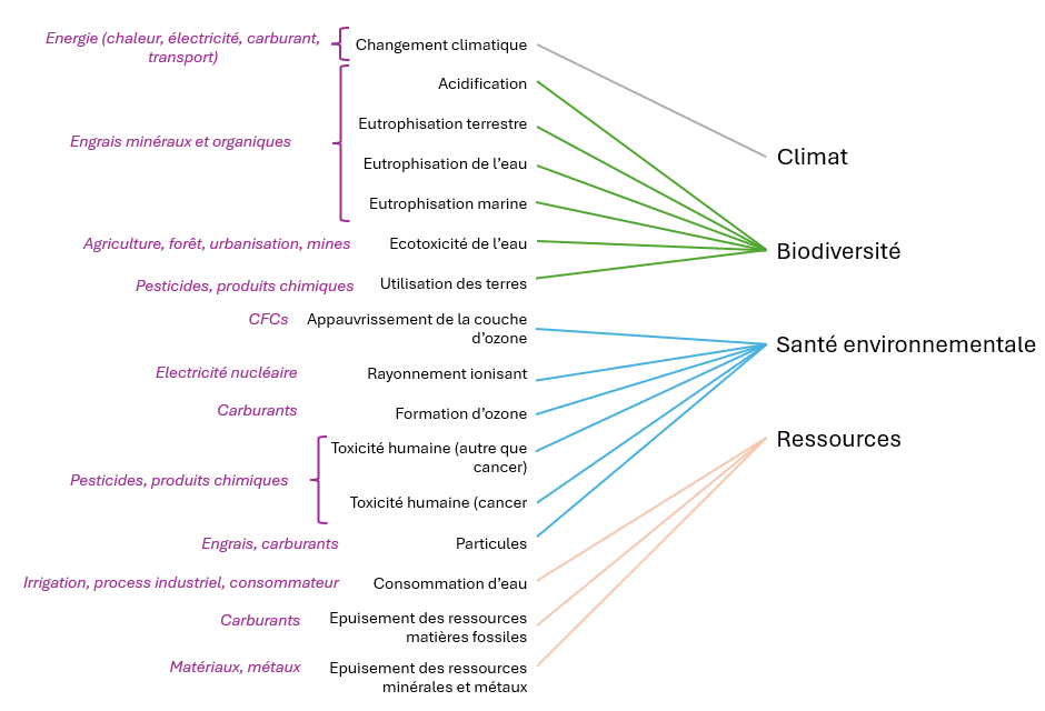 La méthodologie développée par l’ADEME et le ministère en charge du secteur alimentaire s’appuie sur les indicateurs d’analyse du cycle de vie (ACV) définis au niveau européen dans le cadre du Product Environmental Footprint (PEF). Ces indicateurs permettent d’évaluer les impacts environnementaux liés à la consommation d’énergie et d’eau, ainsi qu’aux pratiques agricoles, comme l’irrigation ou l’usage de pesticides et d’engrais. Ils sont regroupés autour de quatre grands enjeux : le climat, la biodiversité, la santé environnementale et les ressources.